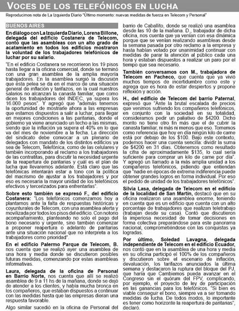 Esto no será solo tarea de los telefónicos. El país asiste a un ataque sobre los trabajadores, mientras la burocracia sindical pacta una tregua, los trabajadores sufren este ajuste con despidos y pérdida del poder adquisitivo.